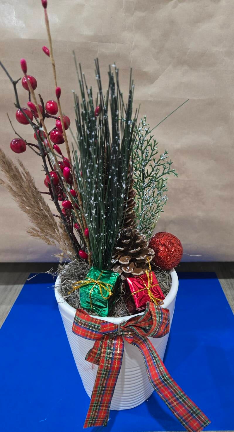 Bel arrangement du temps des fêtes, pot blanc en céramique 30$